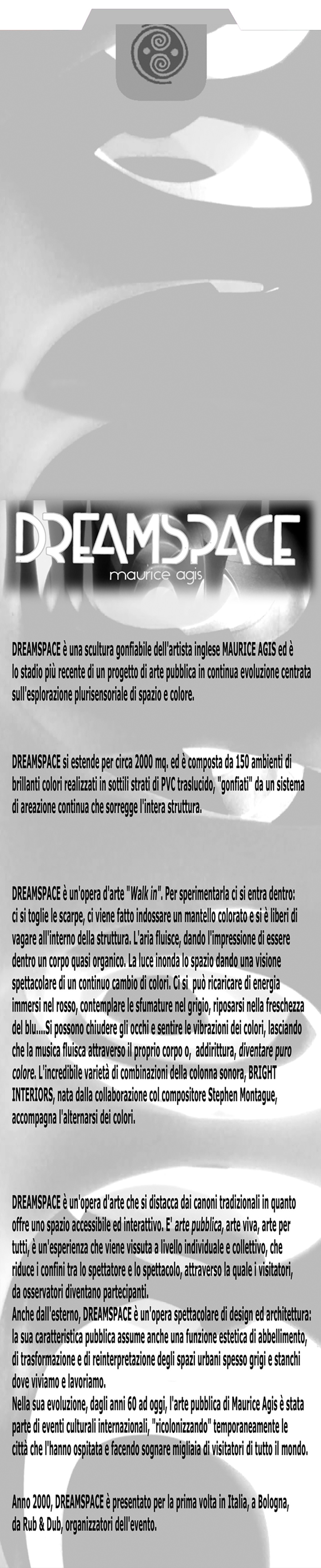 Dreamspace è, in tutti i sensi, l'opera definitiva di Maurice Agis, pioniere della pop art, grande visionario, testa in fiamme. 2000 mq., 150 ambienti in PVC gonfiati da un sistema di aerazione continua, nei fatti un'esperienza immersiva totale dove convergono e convivono luce, colore, suono, forma, movimento. Ogni spettatore crea il proprio personale percorso vagando liberamente negli ambienti in perenne trasfigurazione, diventa parte integrante dell'installazione. Una volta entrati, il mondo fuori diventa inutile, non necessario; ricordi irrilevanti, un errore. Questa meravigliosa utopia è atterrata per la prima volta in Italia, a Bologna; Rollup ha documentato l'evento, restituendolo oggi a chi non c'era. Nel 2000, la navicella spaziale Dreamspace era ancora in orbita.